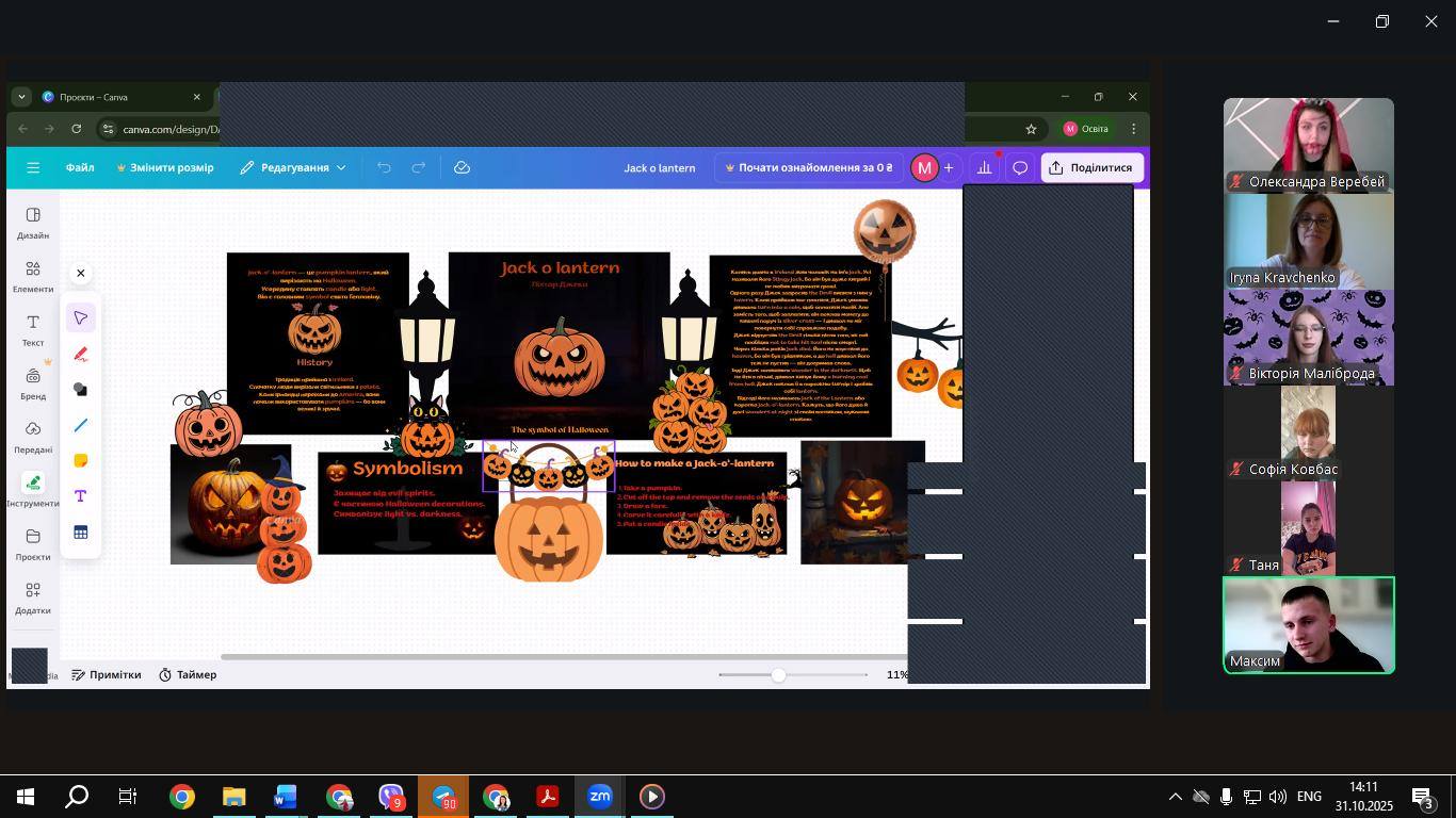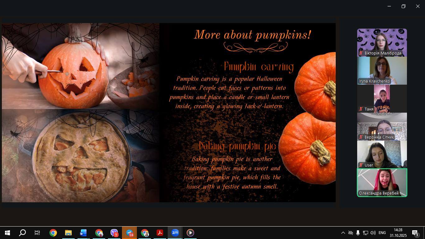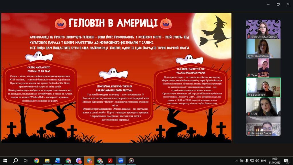 В рамках проведення тижня циклової комісії професійної та практичної підготовки спеціальності А4 Середня освіта ( українська мова і література, англійська мова) 31 жовтня студенти першого курсу долучилися до лінгвокраїнознавчого заходу на тему: «Halloween/Veles Night: Cultural Traditions and Language». Наприкінці жовтня вулиці, кав’ярні, вітрини магазинів нагадують про наближення свята Halloween. Ставлення українців до цього дійства є неоднозначним, однак країнознавча компетентність є важливою складовою для майбутніх учителів англійської мови. Студенти групи СО-12 провели невелике дослідження витоків цього свята, його суть та важливість для давніх кельтів; як традиція святкування розповсюдилася за межі острова Британія, чому на наступний день у багатьох країнах припадає День усіх святих. Цікавими були доповіді студентів щодо символів та традицій святкування; дослідження ідіоматичних виразів у лексиці англійської мови; особливості сучасного святкування. Студенти зазначали, що нашим пращурам-язичникам також було притаманне поклоніння богам, а обряди вшанування бога Велеса нагадують обряди кельтського свята.